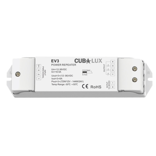 Τάση εισόδου12 - 36 VDC|Τάση εξόδου12-36 VDC|Ισχύς Εξόδου12V / 3 x 72 Watt - 24V / 3 x 144 Watt|Σήμα ελέγχου - εισόδουPWM|Κανάλια εξόδου3 Ch|Θερμοκρασία λειτουργίας (ta) Controller-30...+55 (° C)|(IP) κατηγορία προστασίαςIP20|Διαστάσεις controller ( M x Π x Y )175 x 45 x 27 (mm)|Βάρος96 g